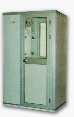 该设备是用于进出口洁净室之前人和物品的吹淋控制,洁净室内,细菌与尘埃的较大发生源是操作者和物品,在操作者及物品进入洁净室之前,先通过风淋室,用洁净空气吹淋去除其衣服物品表面附着的尘埃颗粒。